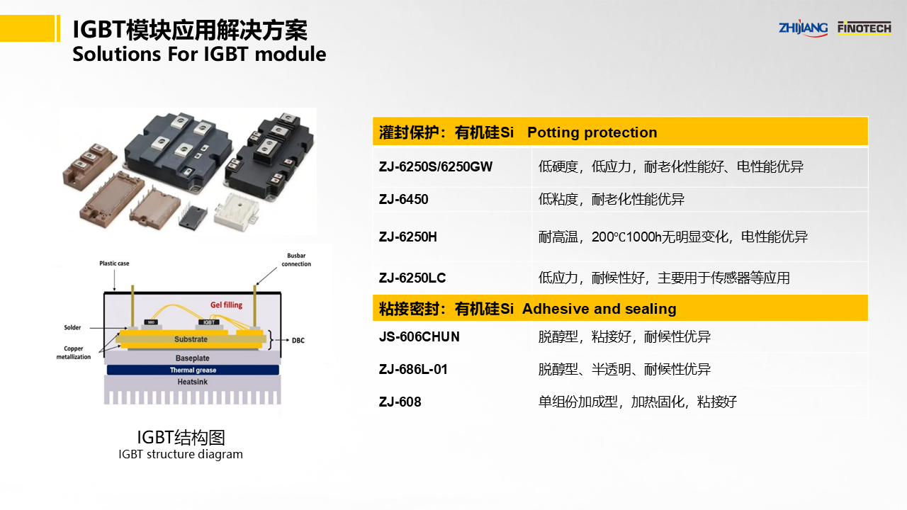 IGBT封裝材料:ZJ-6250S/6250GW、ZJ-6450、ZJ-6250H、ZJ-6250LC有機硅凝膠; IGBT粘接材料:JS-606CHUN、ZJ-686L-01、ZJ-608。